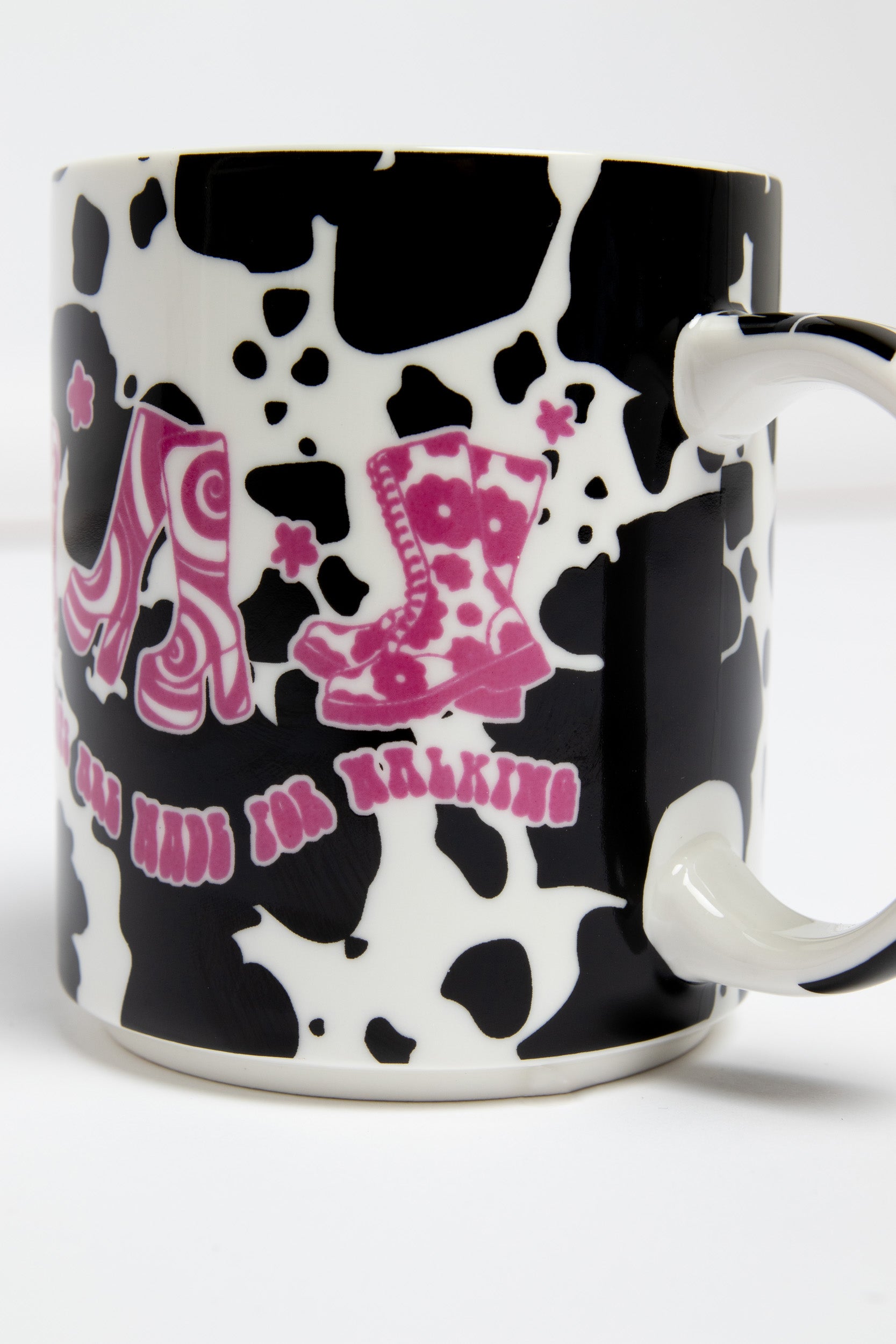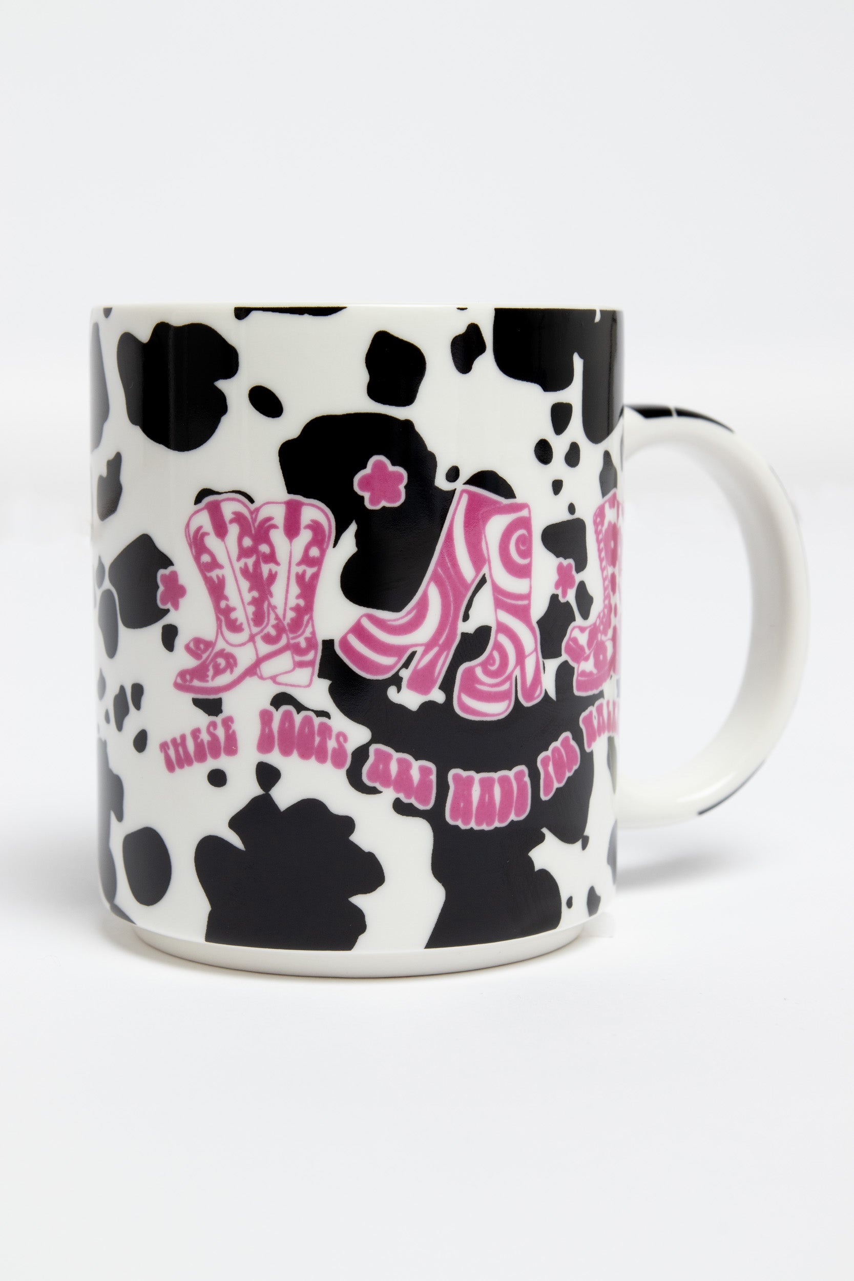 This cowboy mug features a black and white cow print with a pink “These boots are made for walking” graphic, the perfect little gift!
