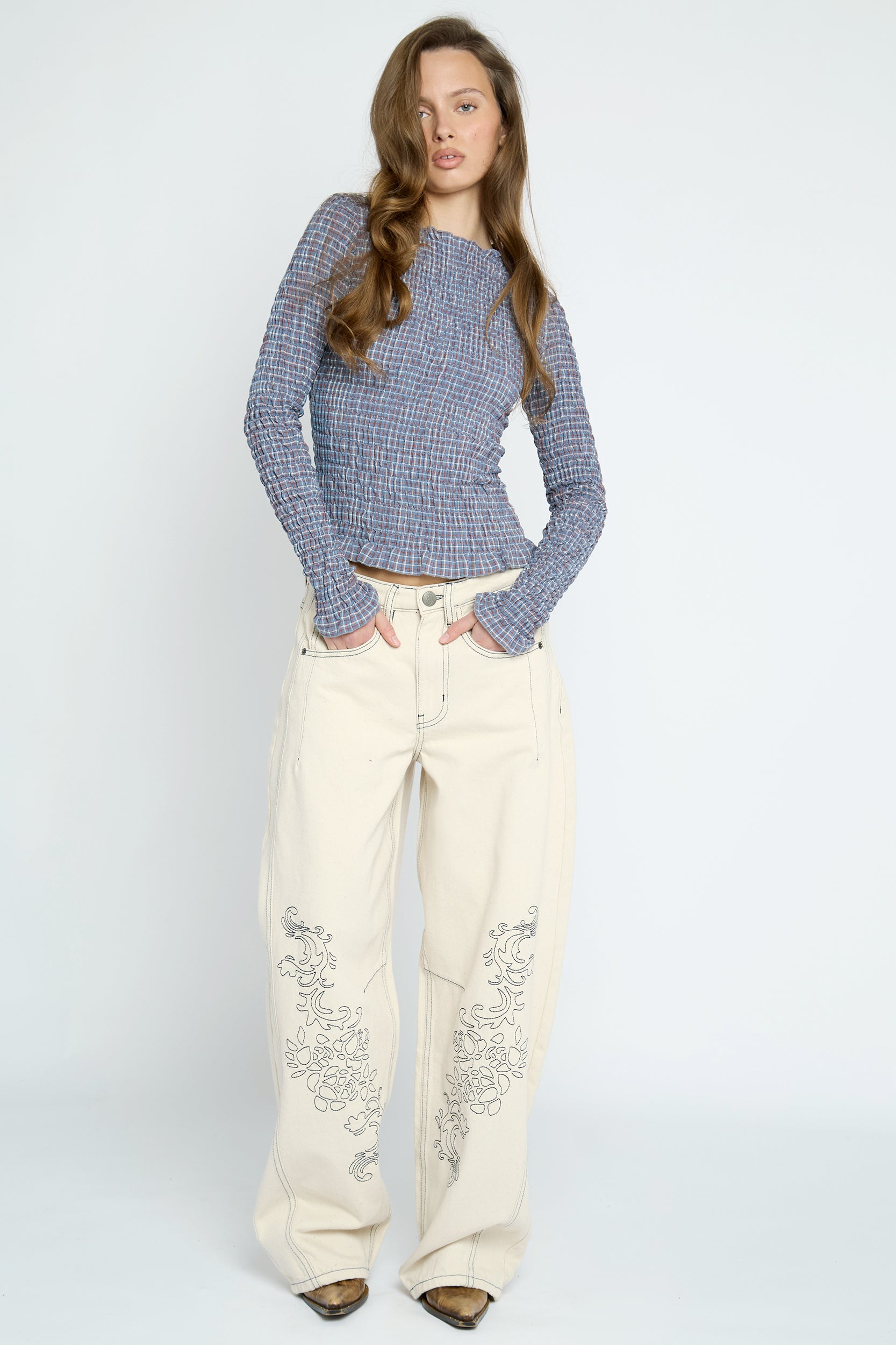 An easy everyday staple with a textured finish. This smocked long sleeve top features an all-over check pattern with a flattering stretch fit that sits close to the body.