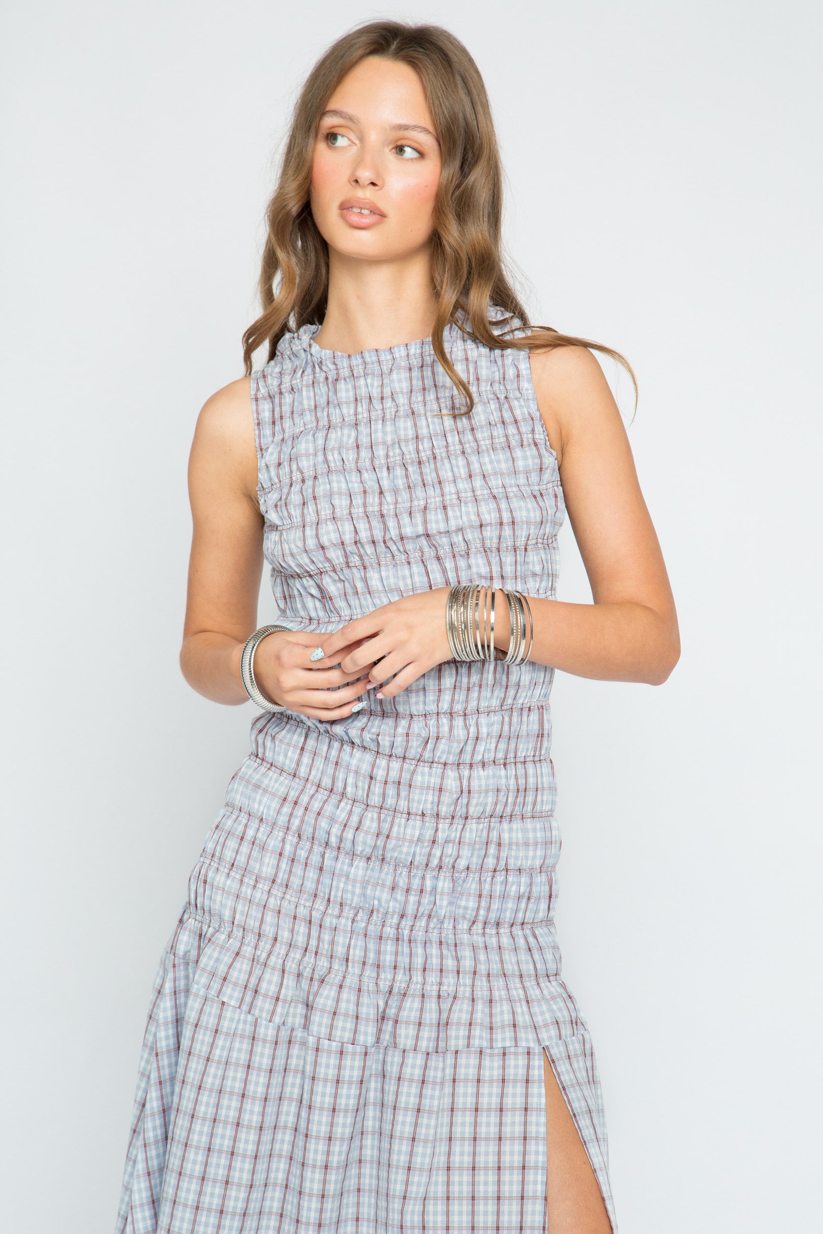 A sleeveless check midi dress with a shirred bodice for a flattering, close fit. Finished with a softly flared skirt and side split for easy movement.
