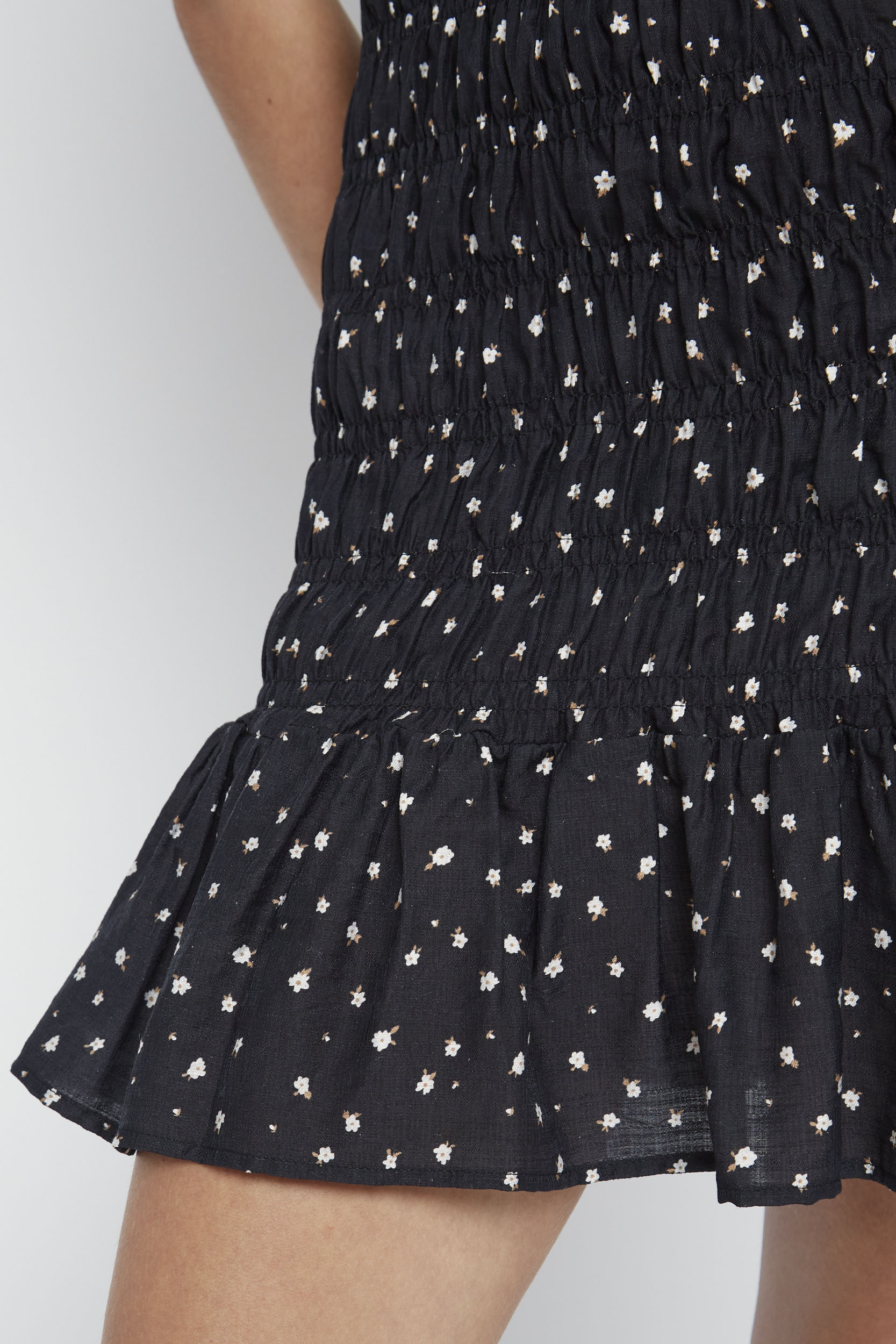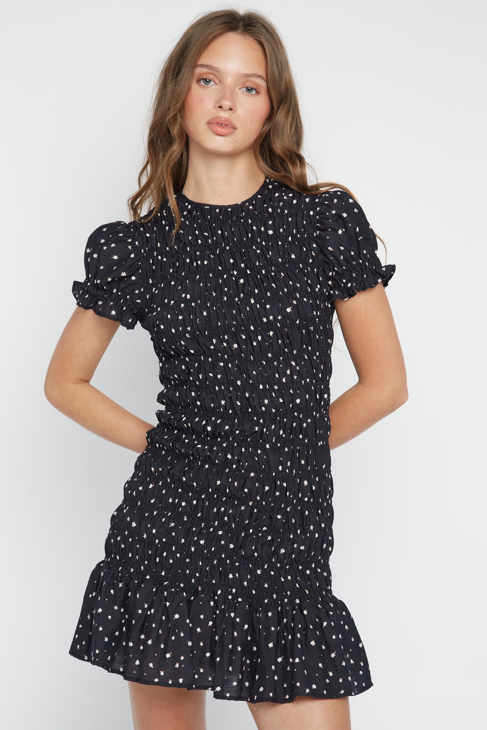 Cute, comfy and made for plans. This ditsy floral mini dress features an all-over smocked fit with puff sleeves and a frill hem for extra movement.
