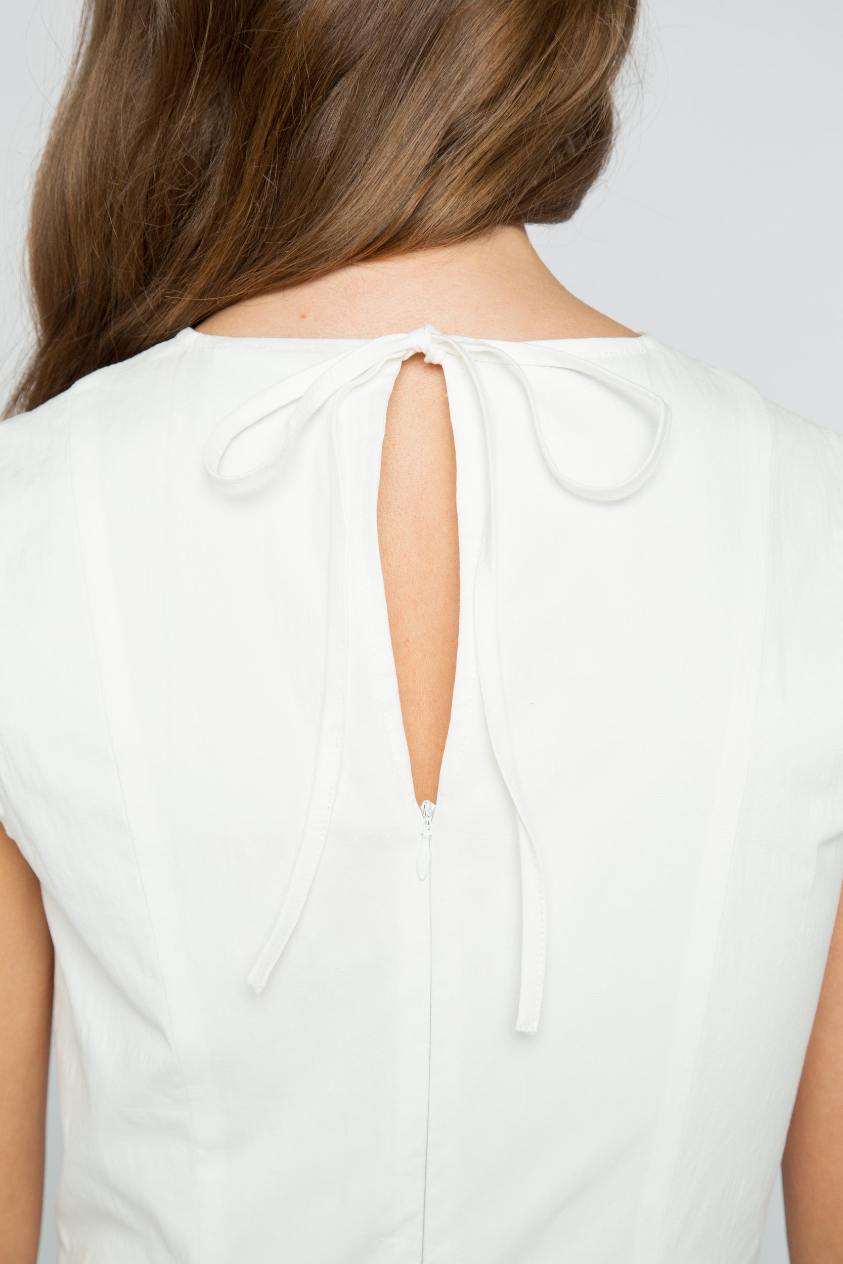 A white playsuit with a clean sleeveless silhouette and high neckline. Designed with a fitted bodice and flared shorts for a simple, modern look.
