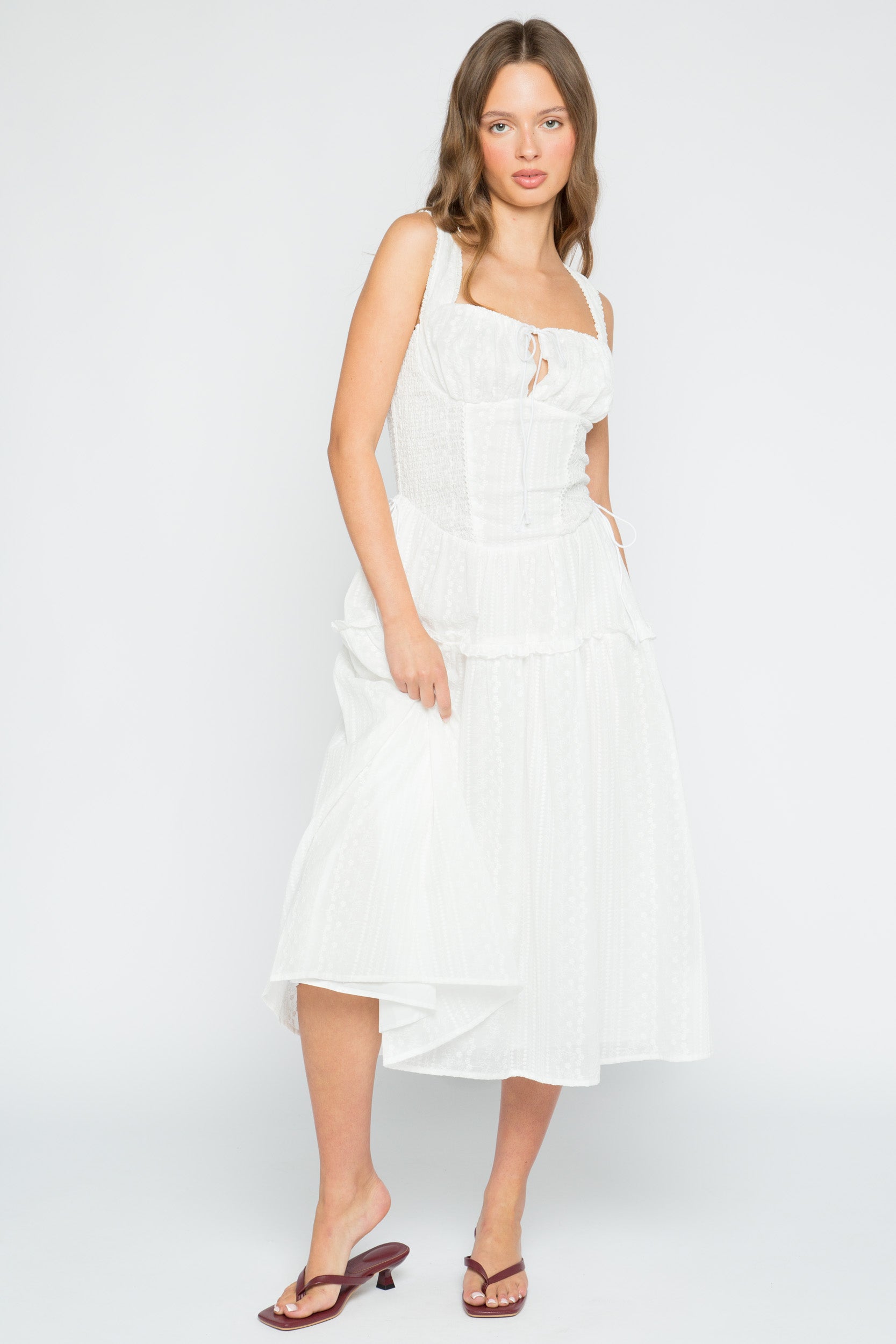 A beautifully feminine midi dress in a soft white finish, perfect for warm-weather occasions. Designed with a structured, corset-style bodice and wide straps for support, it features a subtle tie-front detail at the neckline for a delicate touch. The softly tiered skirt creates gentle movement and a flattering silhouette, while the lightweight textured fabric keeps it airy and comfortable.