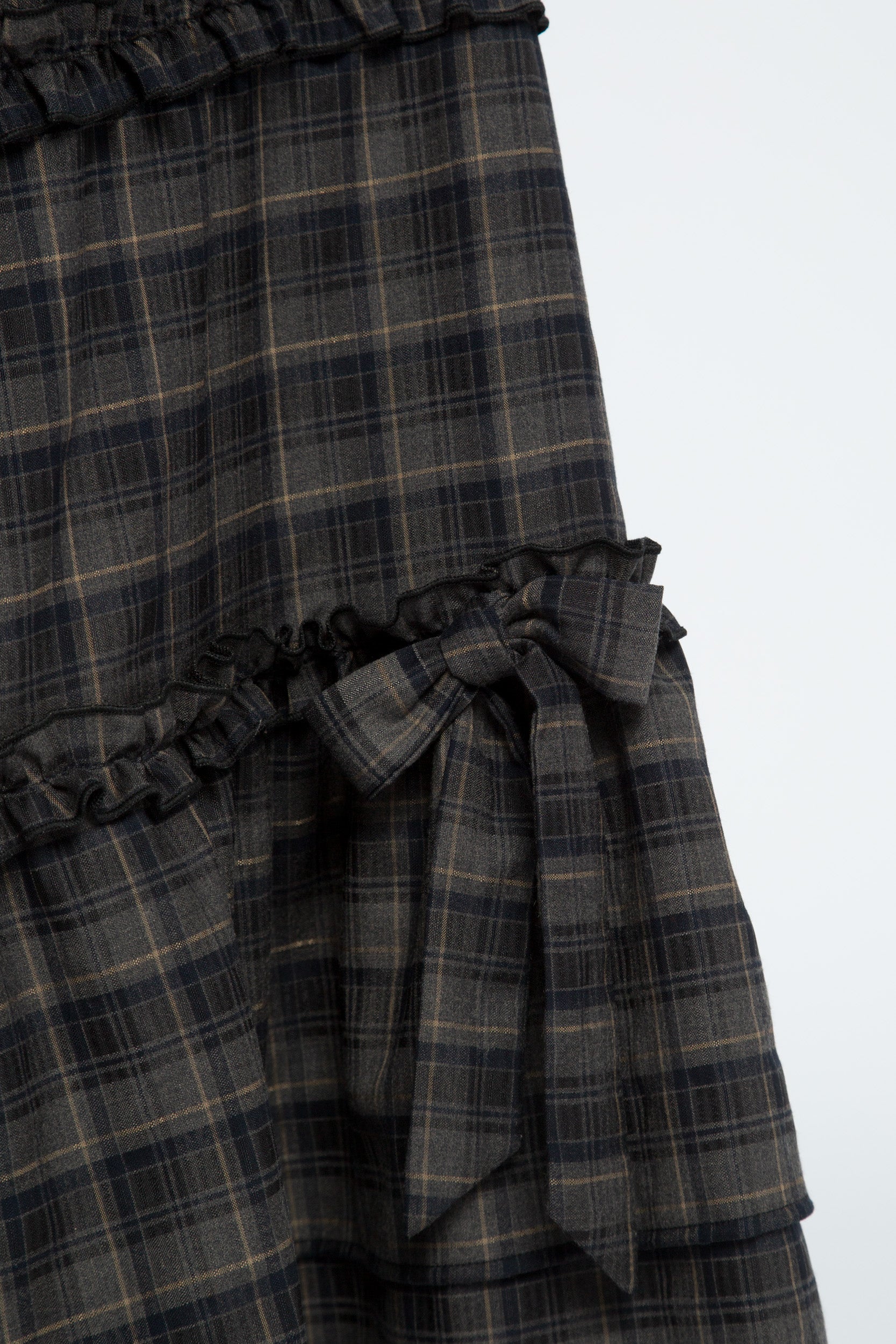 The Snowdrop Maxi Skirt features a brown tonal check pattern with layered frills and two small bows at the bottom on each side. It has a mid-rise, elasticated waist and a full maxi length for an easy, comfortable fit.