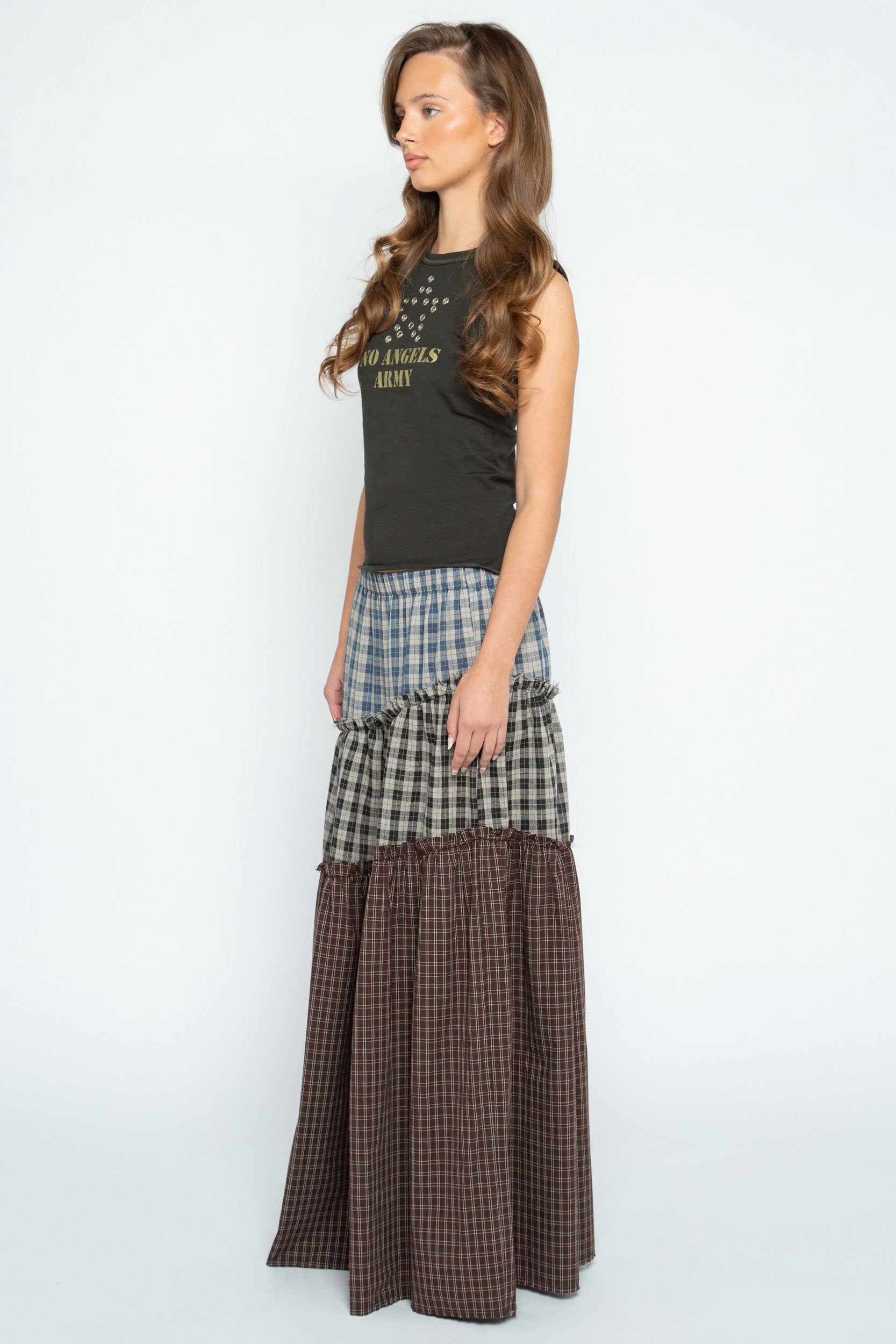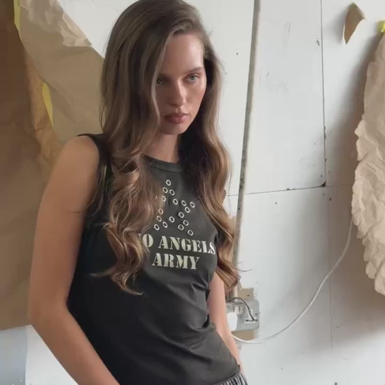 The No Angel Tank Top comes in khaki green with a slim, waist-length fit and sleeveless cut. A central gold “No Angels Army” graphic stands out on the front, framed with a star design crafted from small eyelets for subtle edge and texture.