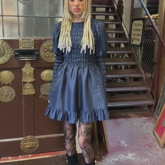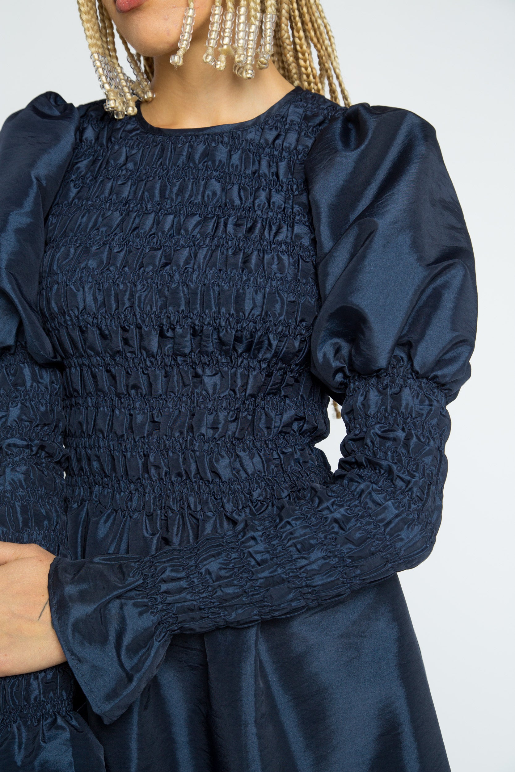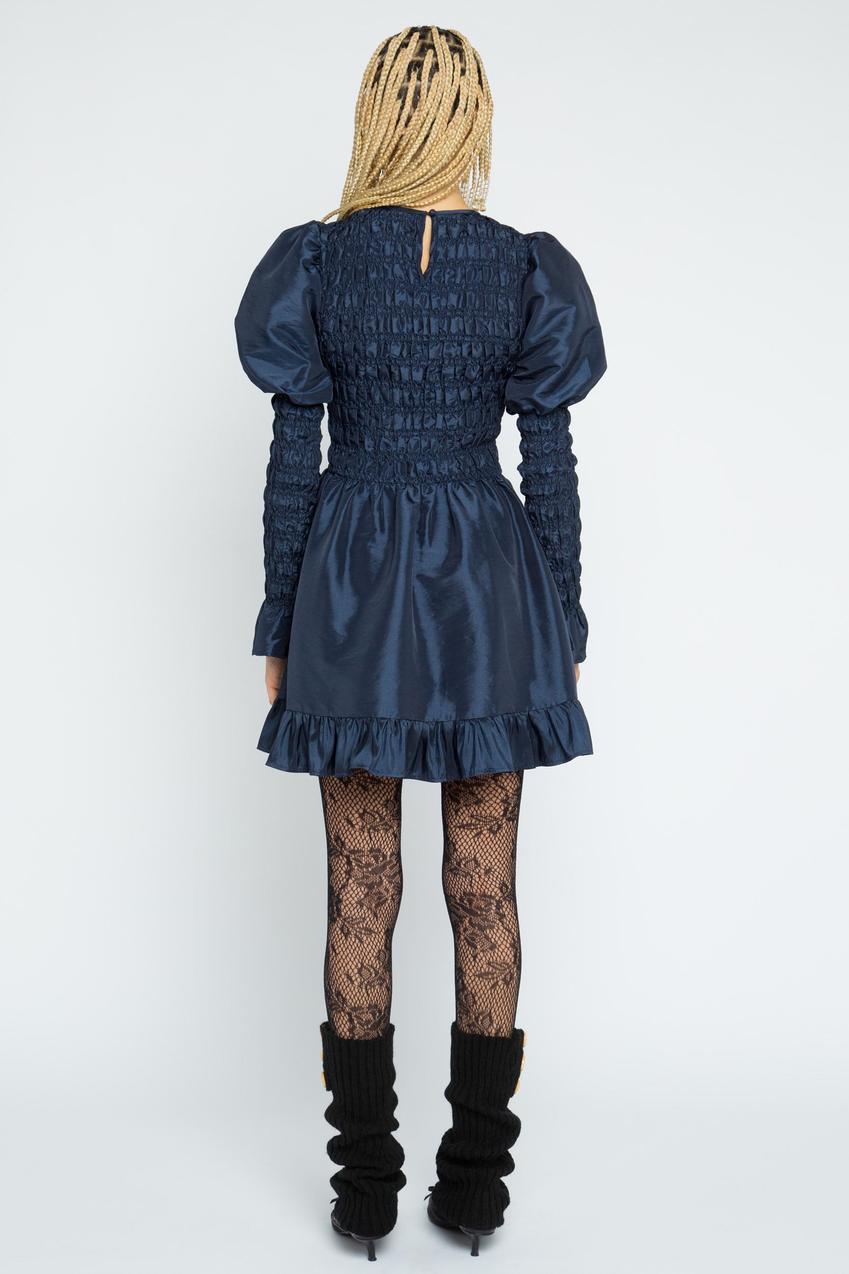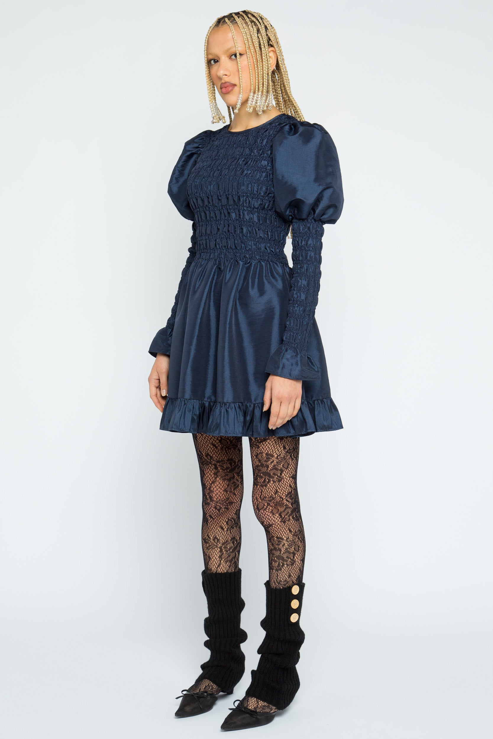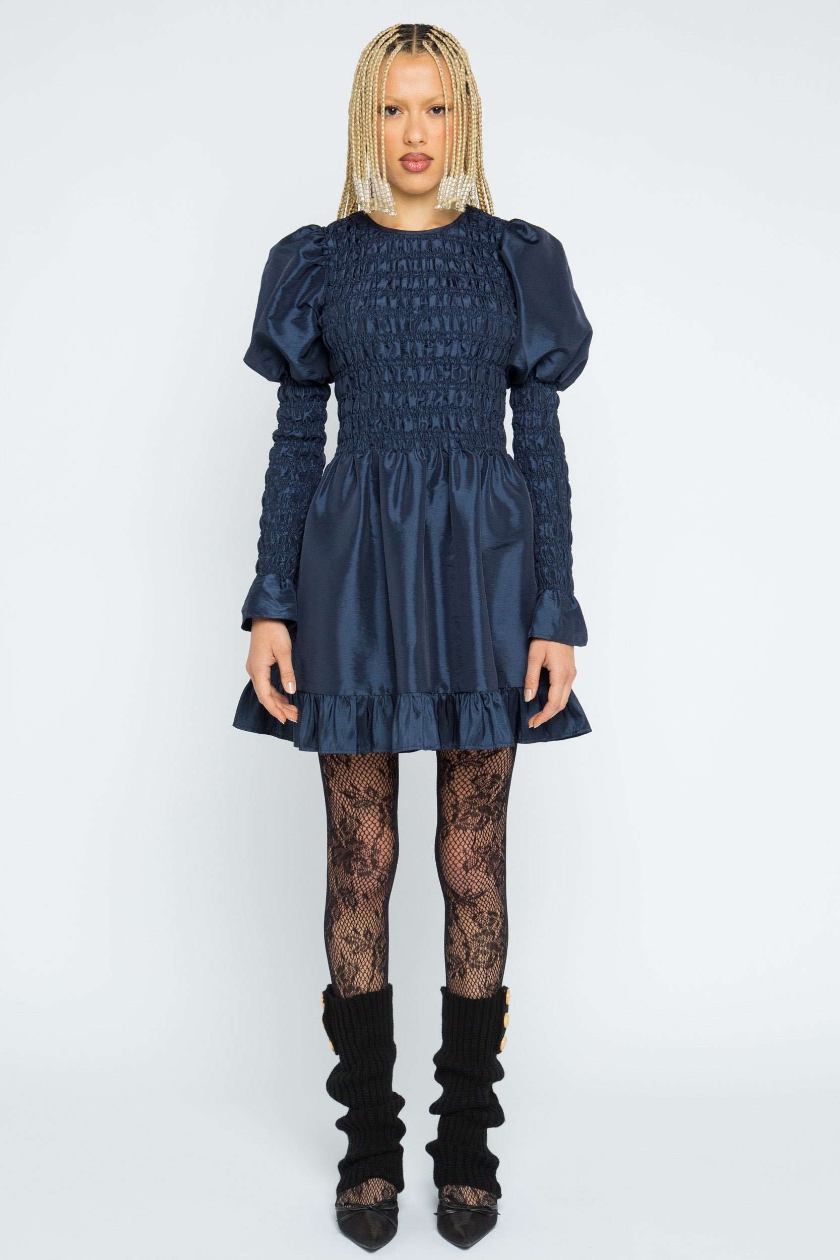 The Thorn Mini Dress is a shiny navy mini with shirred detailing through the bodice and sleeves for a flattering fit. Finished with puff sleeves and an A-line skirt that flares at the hem. The perfect dress for Party season.